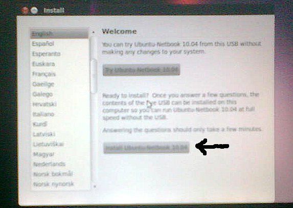 5. On the prepare disk space, I chose the erase and use the entire disk, since I was prepared to completely format the netbook. This is also the option to pick if you are installing Ubuntu on a new computer.